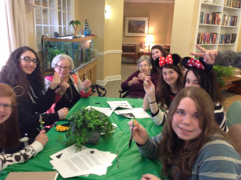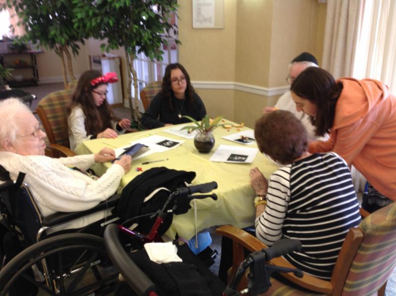 AHA 8th grade students visited seniors at the Abrams Residence to celebrate Tu B’Shvat. The students and seniors made a holiday-themed craft project together, shared fruit snacks, and simply had fun interacting with one another. The visit concluded with the seniors offering their insights about how to lead a successful life- they recommended optimism, not being afraid to pursue one’s dream, and following a path that leads to doing the right thing- words of wisdom, indeed!